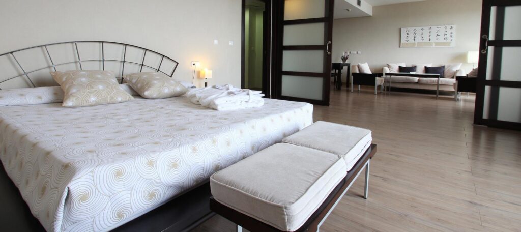 ROOMS: Its large 26 m2 rooms have 6 m2 terraces with sea views. All are equipped: with two double beds (no additional beds available), television, telephone, writing desk, air conditioning / heating (depending on the season), safe, mini bar (chargeable), bathroom: bath, shower, WC, bidet, double sink, hairdryer, magnifying mirror, amenities and telephone.